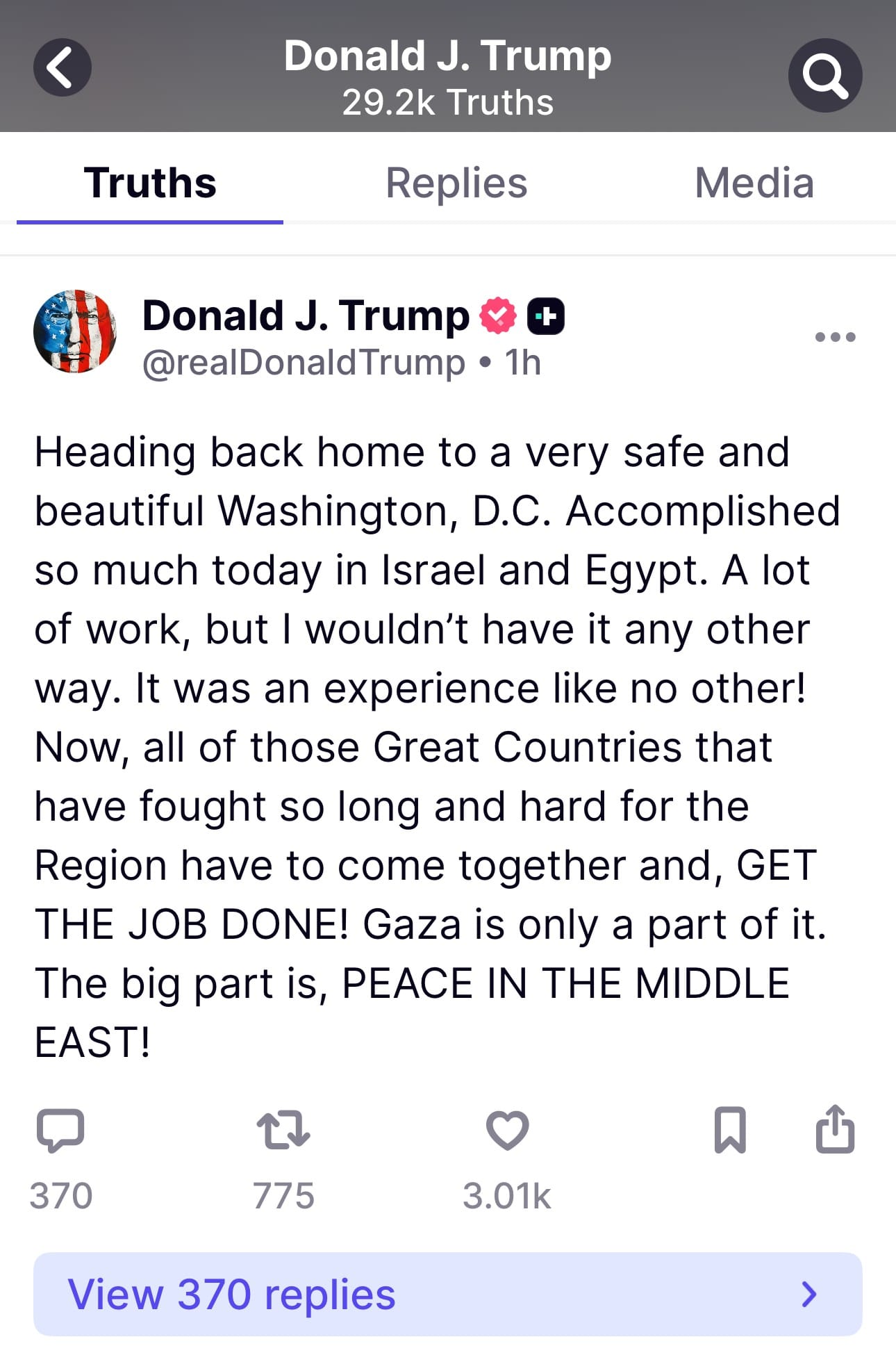 أوضح الرئيس دونالد ترمب أبعاد خطته للسلام في الشرق الأوسط،، في تغريدة نشرها، اليوم، على منصته ” تروث سوشيال” وتزامن ذلك مع كشف تفاصيل “إعلان السلام ” الذي جرى توقيعه في شرم الشيخ .