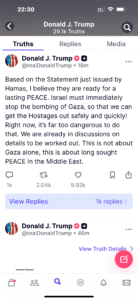 وخطا ترمب خطوة إضافية وعملية لوقف النار في غزة، بإصداره طلبا  علنياً  إلى الحكومة  الإسرائيلية، وهو أقرب إلى التوجيه منه إلى الطلب ، إذ قال  إن “على إسرائيل أن توقف قصف غزة فورا حتى نتمكن من إخراج الرهائن بأمان وسرعة”.