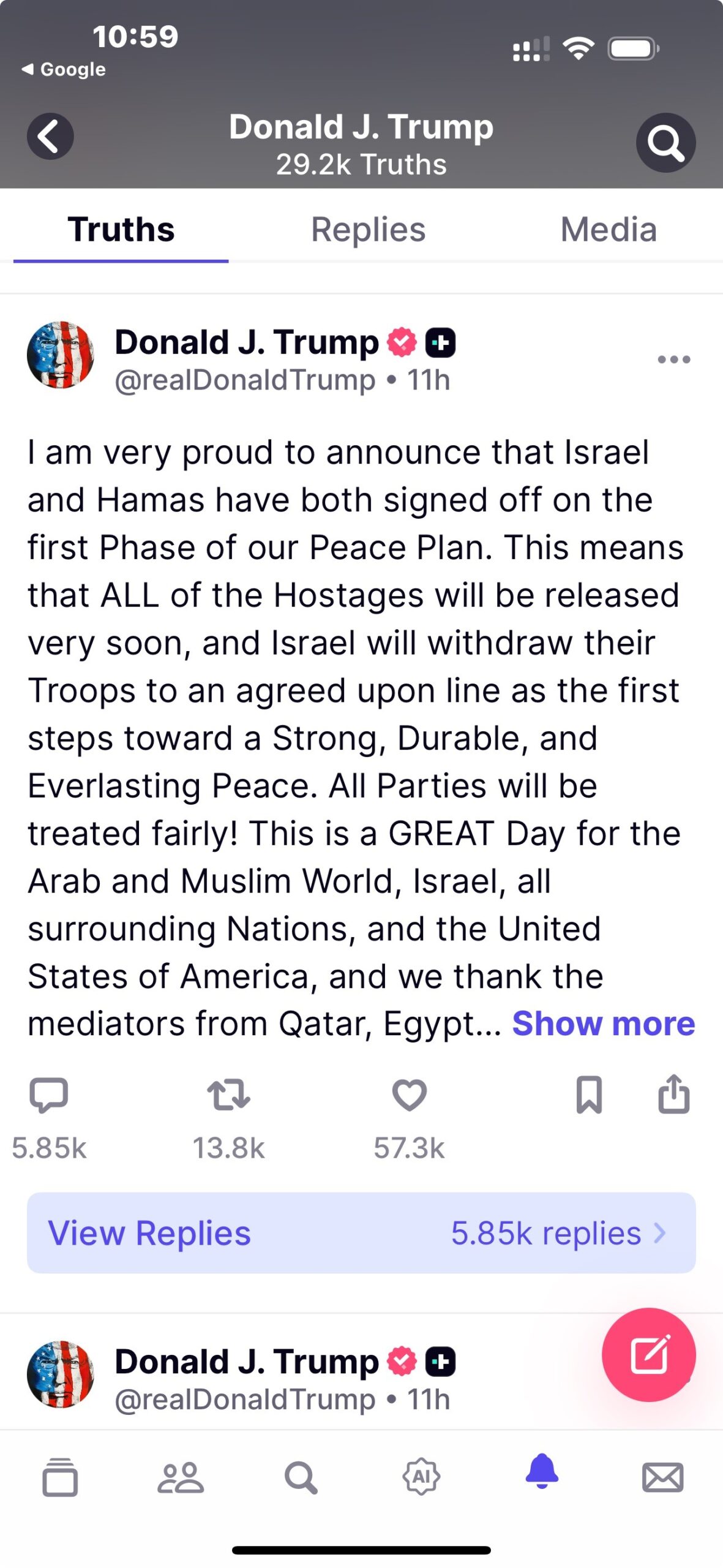 ترمب اختار منصته (تروث سوشيال ) Truth Social للإعلان عن التوصل للاتفاق ، وقال في تغريدة :” أنا فخور جدا بالإعلان عن قيام إسرائيل وحركة حماس بالتوقيع على المرحلة الأولى من خطة السلام التي طرحناها. ويعني ذلك أنه سيتم الإفراج عن كافة الرهائن في القريب العاجل، وأن إسرائيل ستسحب قواتها حتى الخط المتفق عليه”.