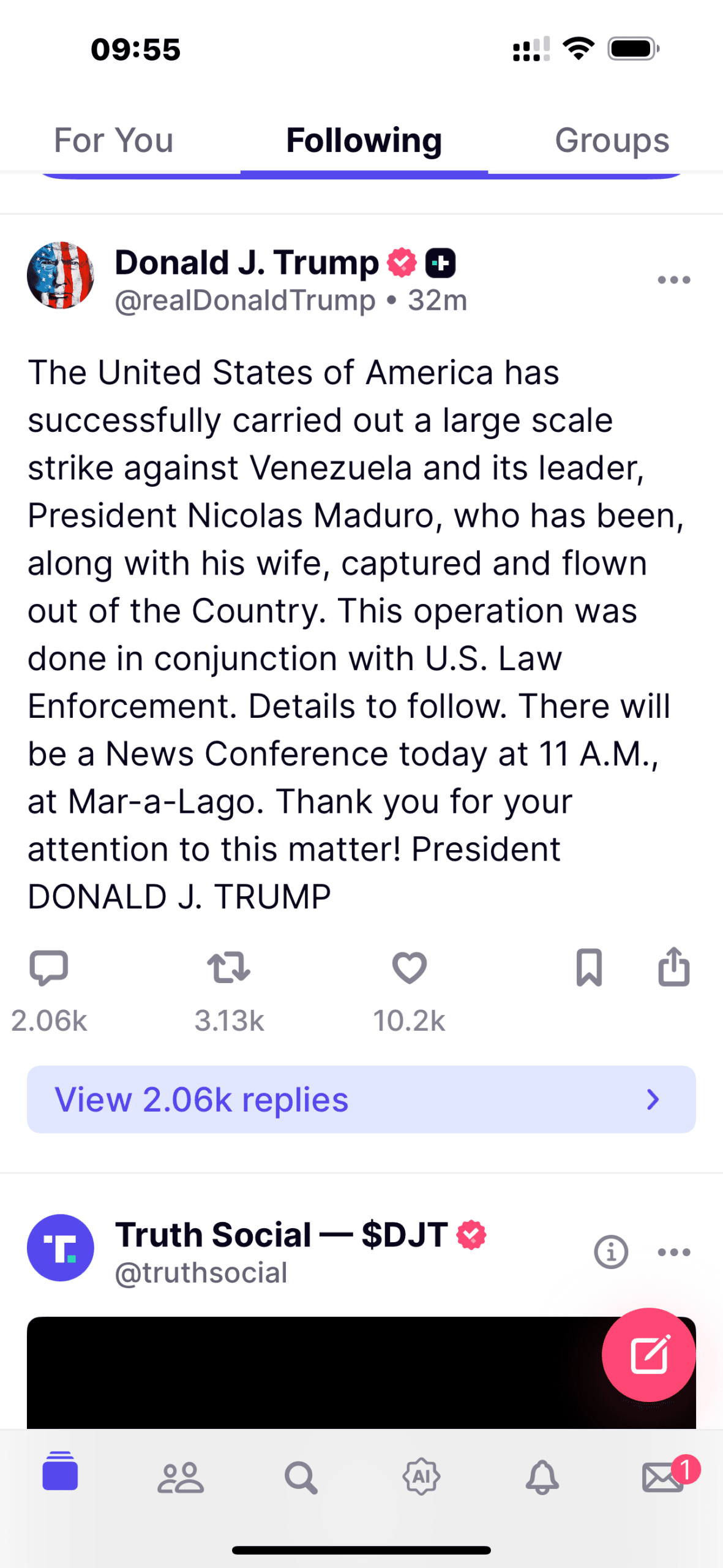 وقال في منشور على منصته ” تروث سوشيال”إن : “الولايات المتحدة الأمريكية نفذت بنجاح عملية عسكرية واسعة النطاق ضد فنزويلا ورئيسها نيكولاس مادورو، الذي قبض عليه مع زوجته ونقلهما خارج البلاد.