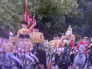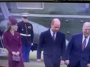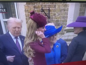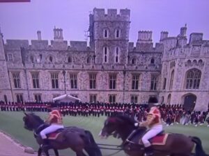 وكان الأمير وليام، أمير ويلز،  وزوجته كاثرين، في استقبال الرئيس الأميركي وقرينته  لدى وصولهما إلى القلعة، بطائرة مروحية ، ثم استقبلهما الملك والملكة وانطلق موكب عربة تجرها خيول، جلس داخلها في الصف الأول تشارلز الثالث وترمب، ثم  كاميليا و ميلانيا ، وفي الصف الثالث وليام وكاثرين.