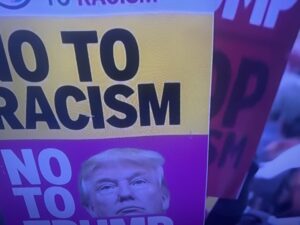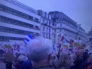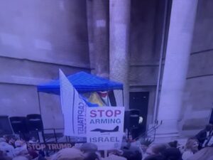 وشهد وسط  لندن خروج  جشد من المتظاهرين، المنددين بزيارة ترمب، ورفعوا  أعلاما فلسطينية ، ولافتات  تقول ” لا لترمب” و  ” أوقفوا تسليح إسرائيل” وشعارات تحمل انتقادات  عدة  لترمب ، وجرى ذلك وسط إجراءات أمنية مشددة، ومعلوم  ان القانون البريطاني ىيتيح حق التظاهر، ويحمي المتظاهرين السلميين .
