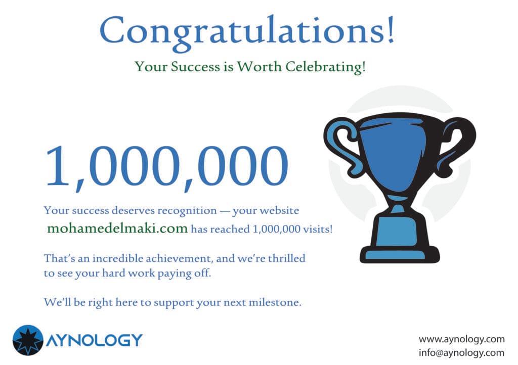 تلقيت رسالة تهنئة  Congratulations من الشركة المنفذة للموقع AYNOLOGY في شهر أغسطس2025 أي قبل ان يكمل الموقع عامه الأول، وأكدت أن عدد الزيارات لموقعي الالكتروني بلغ مليون زيارة.